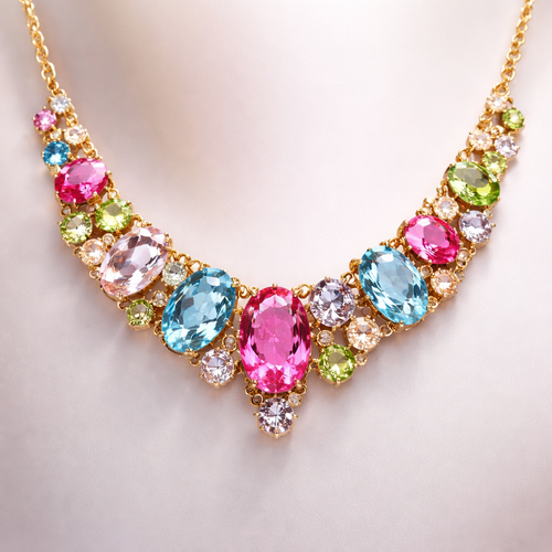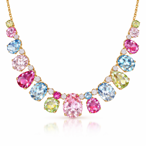 Gold prong set Gemstone necklace. Gems are different sizes and the colors are light pink, hot pink, blue, light green, a...