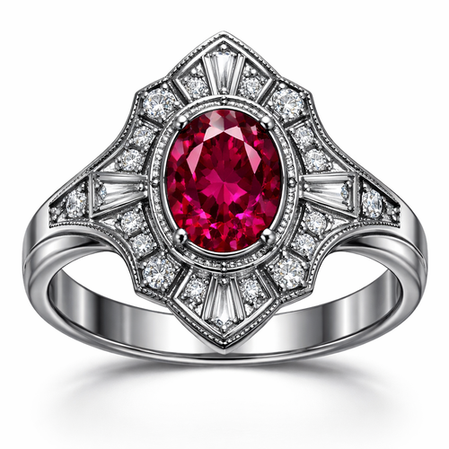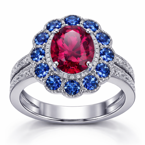 I want a stainless steel ring with a ruby in the middle and blue sapphires all around
