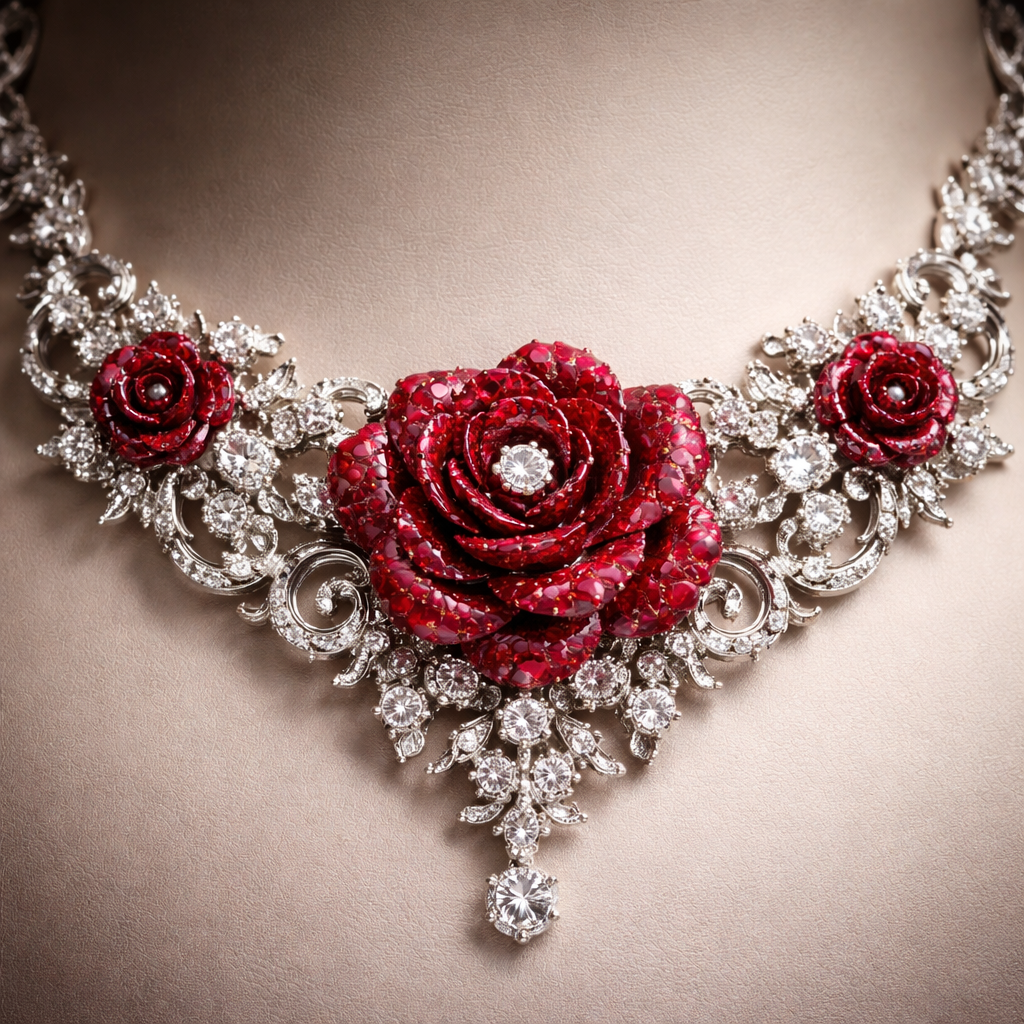 A rose with red rubies diamonds a mother set of small roses on each side diamonds in between , victorian style