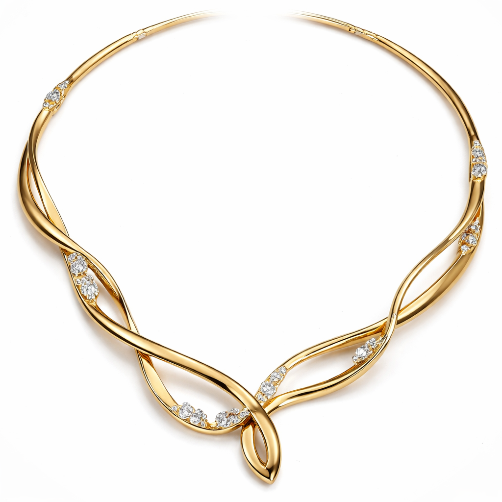 A necklace made of one flat wire that is twisted around itself that has small links n articulations that makes it flexible and is made of gold n diamond, modern style