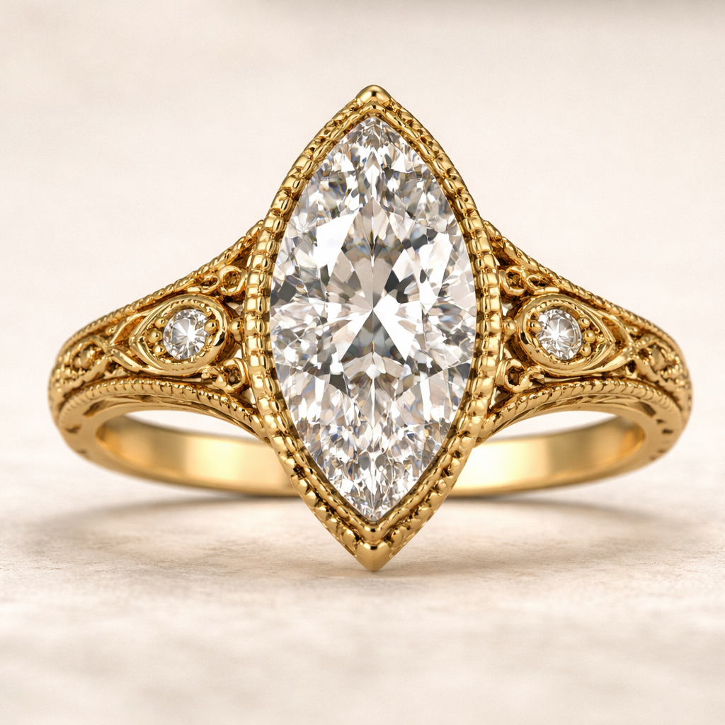 Create an old mine 4 carat marquise cut ring in yellow gold