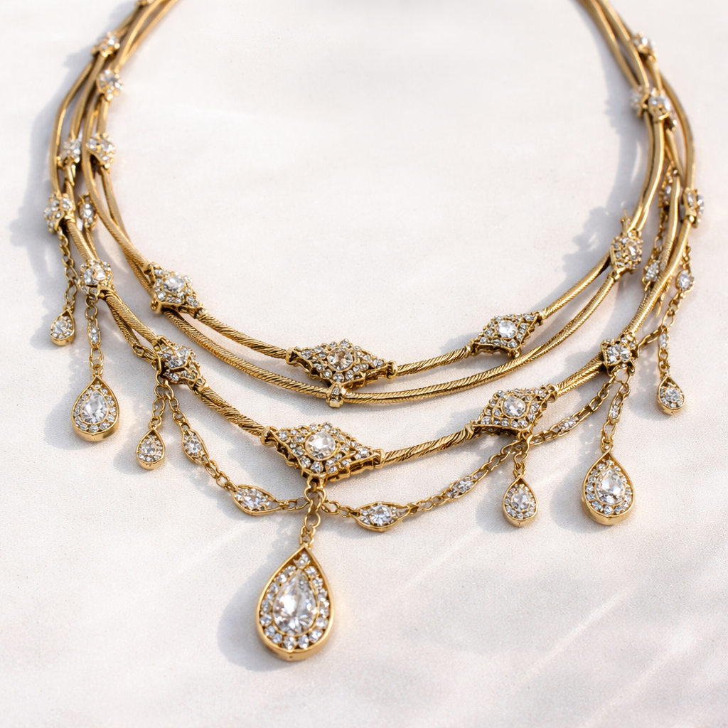 A necklace made of a flat wire twisted 3 times with links n articulations and gold n diamond, bohemian style