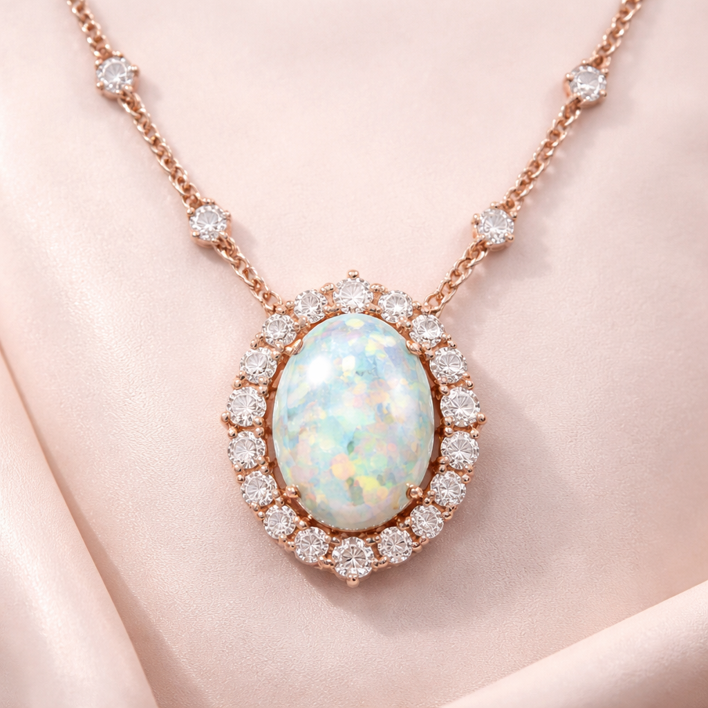 A modern women's ring made of rose gold with opal and diamond stones suitable for gift. I would like to have beautiful necklace with Opal in the middle and with the diamonds around