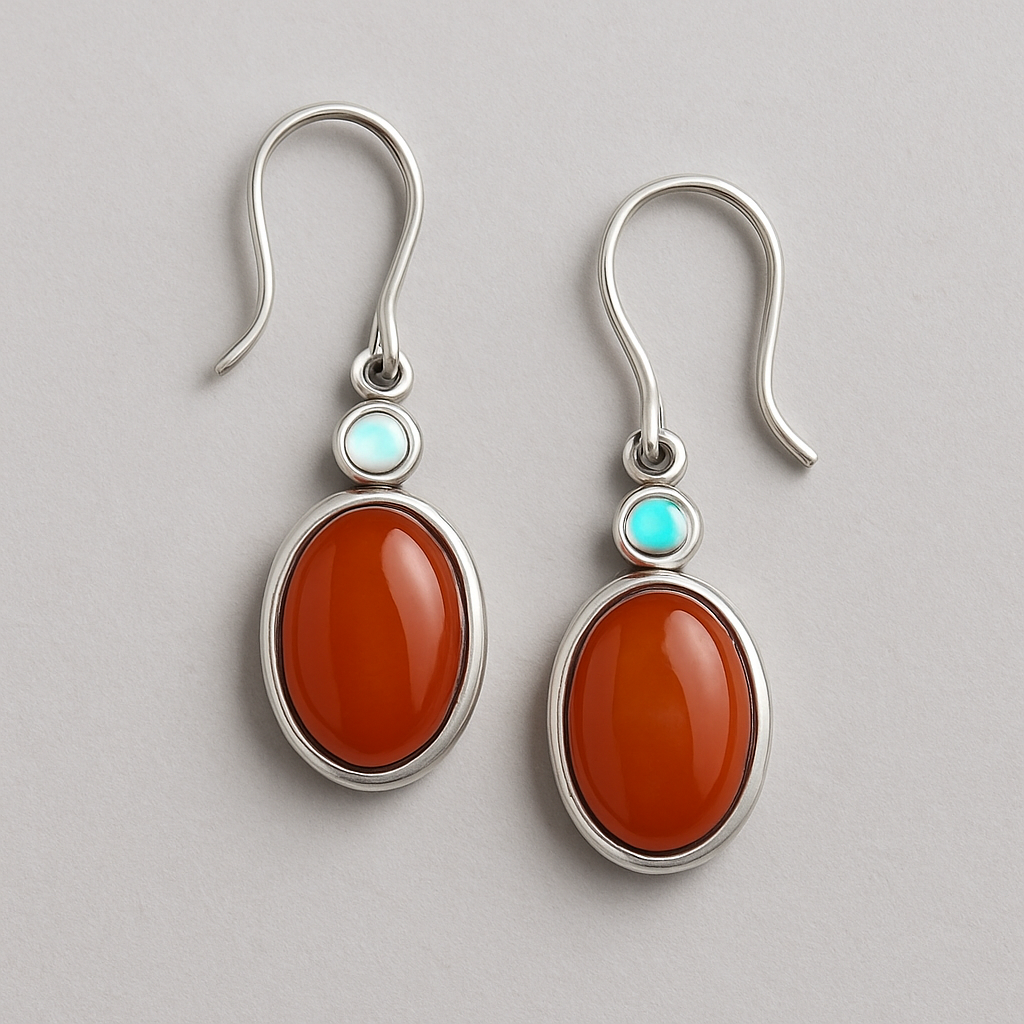 Carnelian oval stone, silver earrings with round opal accent, scandinavian style
