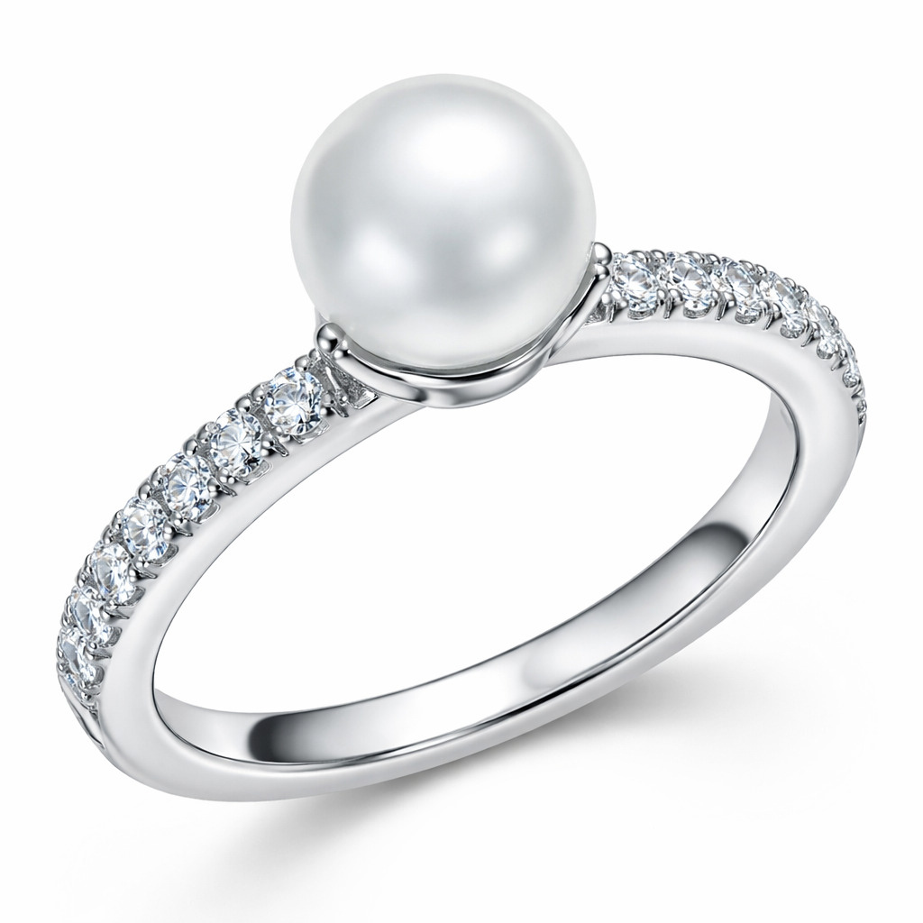 I want a single white pearl raised a little higher and secured to the white band with moissiante down the band