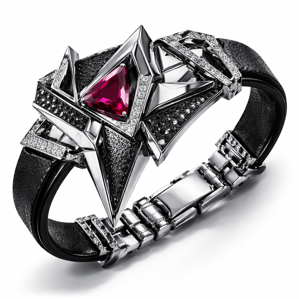 Modern pendant adding leather Geomatric shape and architecture shape and voulme of edgy style of bracelet with diamonds and black diamonds and rubybof white background