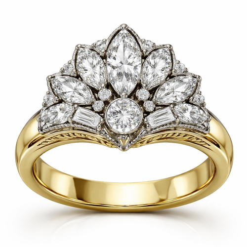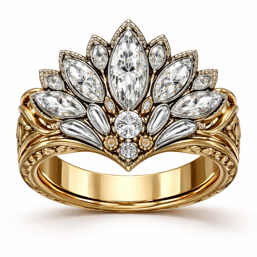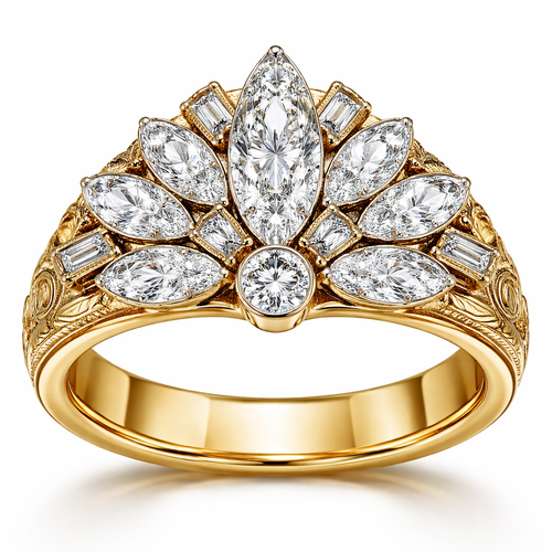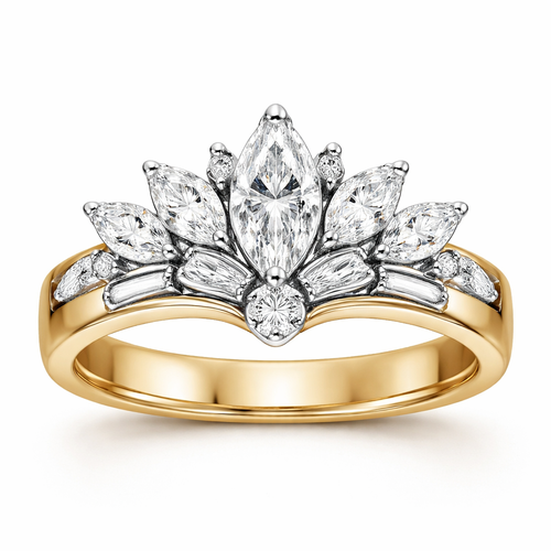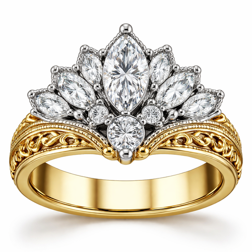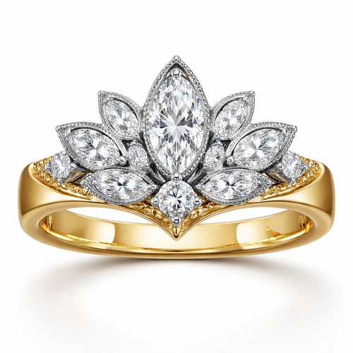 Create ring with .6 karat marquise centered, with .25 round stone directly under it with 6 more smaller marquise diamond...