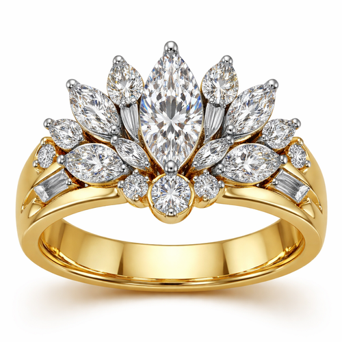Create a ring in 14k yellow gold, set in platinum. The center stone is a .60 size marquise diamond with a .25 round diam...