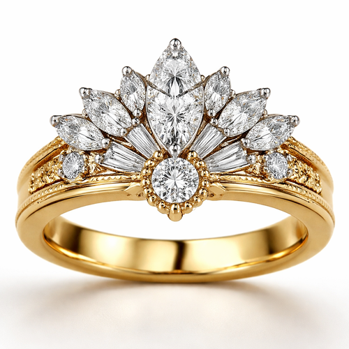 Create a fan style ring featuring a .6 marquise diamond in the center with a .25 carat round stone directly underneath s...