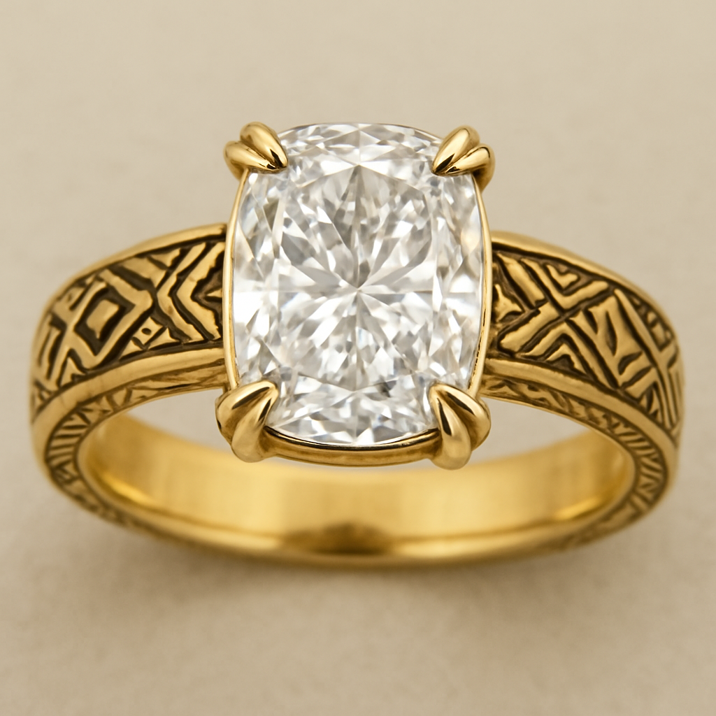 Elongated cushion, cut diamond set in yellow gold band, taping with Talon prongs, tribal style