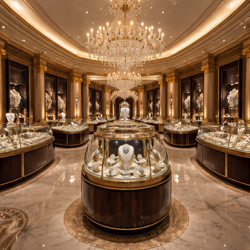 A giant jewellery store with all kinds of jewellery with billion dollar jewels, museum quality rings and more with not many people , luxury style