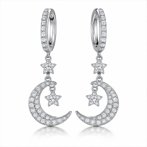A classic women's earrings made of silver with diamond stones suitable for daily wear. brinco com estrelas e luas