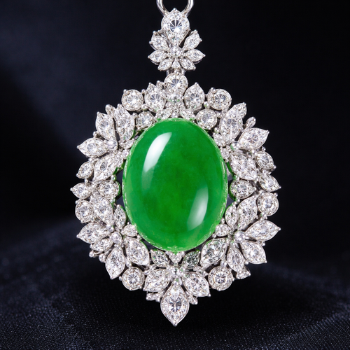 Jadeite cabochon diamond pendant. With flower layering surrounding the jadeite in the middle