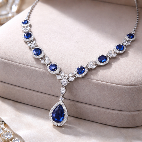 A luxury women's necklace made of silver with diamond and sapphire stones suitable for daily wear
