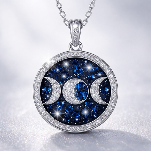 A women's pendant made of silver with diamond and sapphire stones suitable for daily wear. pingente redondo fases da lua
