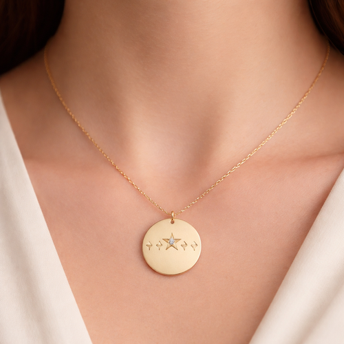 A minimalist women's necklace. colar redondo com as fases da lua e uma estrela de 6 pontas ao meio