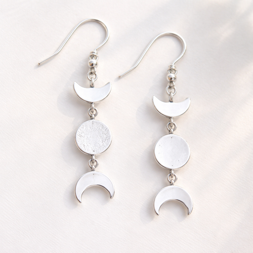 A minimalist women's earrings made of silver suitable for daily wear. tres brincos cada um com uma fase da lua
