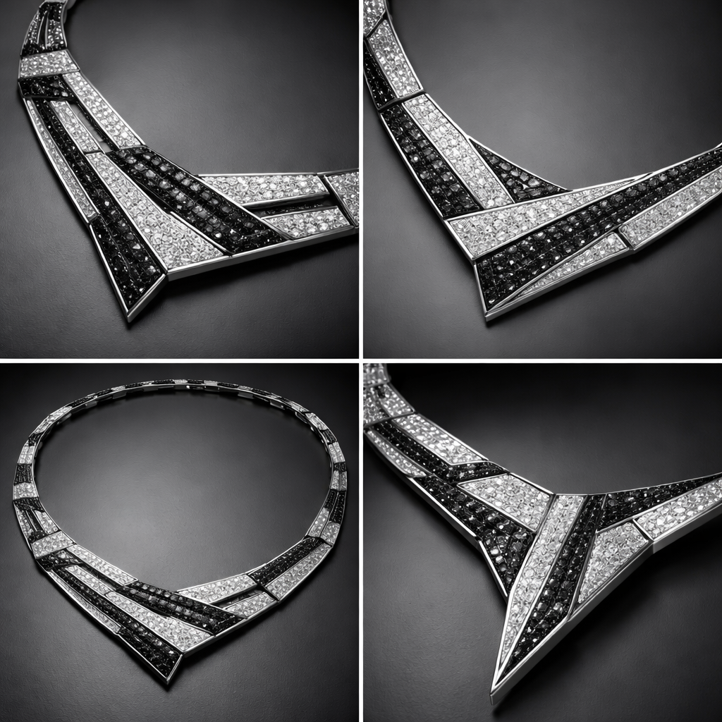 Geometric necklas for men of different angles and shapes and lines of white and black diamonds