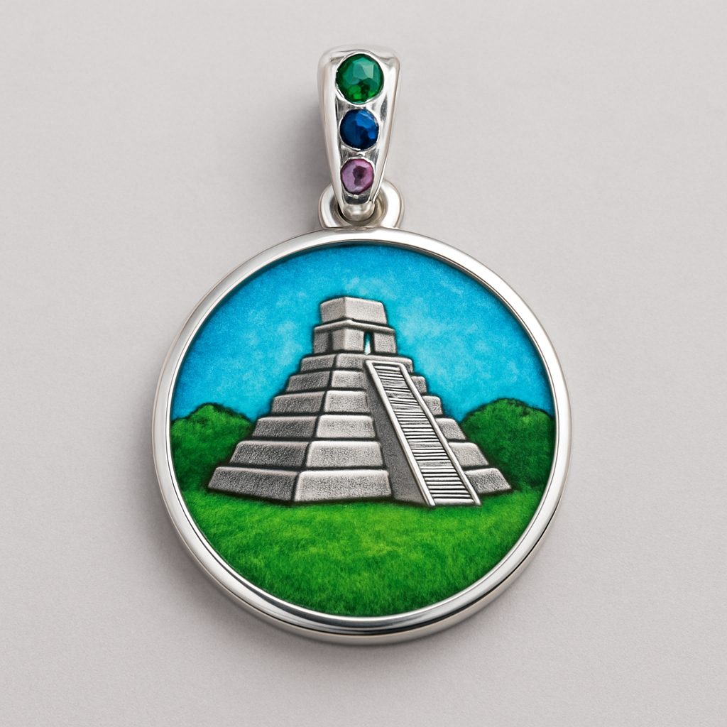 Circle 8mm of piramides of Tikal Guatemala in Silver 925 enamel, pasto,stones on bail