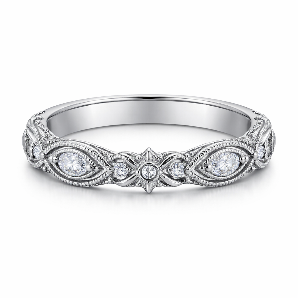 I want a ring that has four designs around the band and two small oval diamonds and 2 Small Circle diamonds spaced out along the band