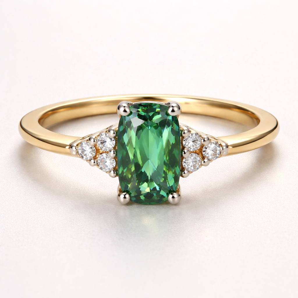 A yellow gold 18 carat thin band with a sharp angled edge ring. Central green sapphire in an elongated cushion cut. Either side of the central sapphire are three very small diamonds on each side in a triangle formation. The profile of the stones are raised in profile to accommodate a round wedding band underneath. All stones are held in place by platinum prongs.
