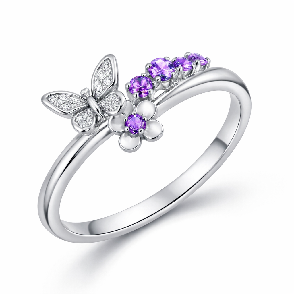A women's ring made of silver with amethyst stones. simpel and elegent a small butterfly and a flower, modern style