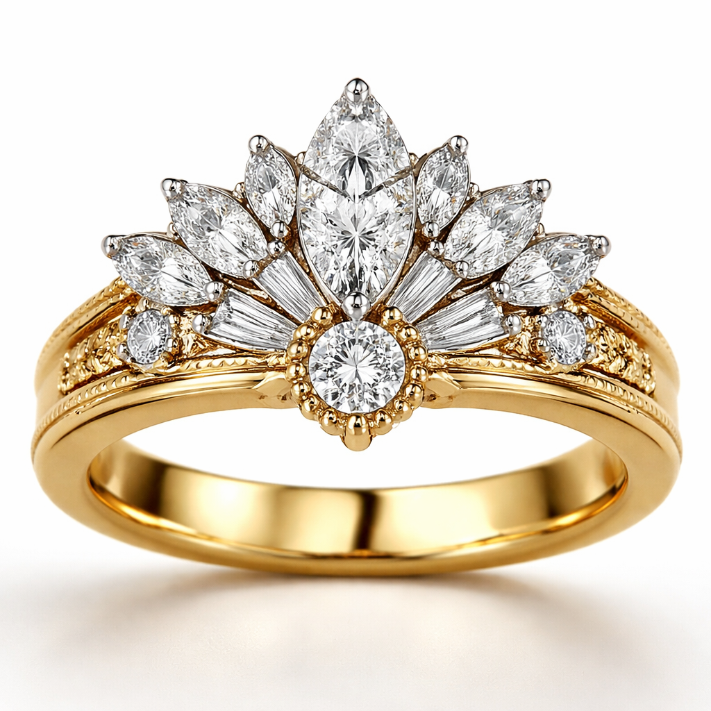Create a ring in 14k yellow gold, set in platinum. The center stone is a .60 size marquise diamond with a .25 round diamond set directly under the marquise. Add 6 more marquise shaped diamonds and 2 more round diamonds in the shape of a fan with a thick gold yellow gold band. Add 4 to six small rectangle shaped baguettes throughout the design