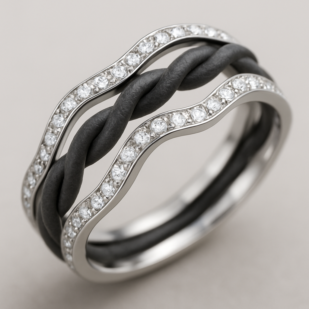 Silberner Ring mit dünnen Lederband wellenförmig eingefädelt in Silbergerüst mit Diamanten besetzt eingearbeitet, luxury style