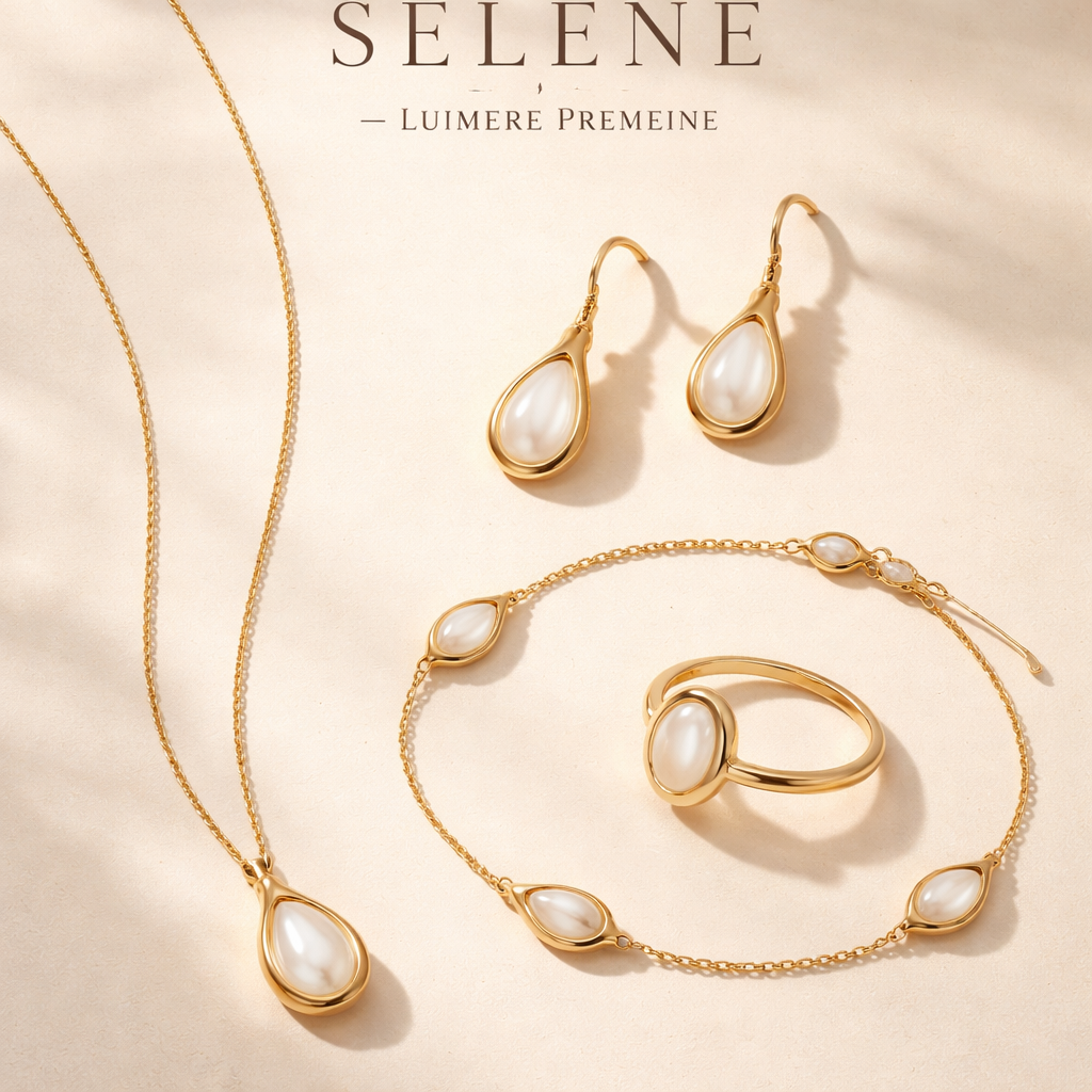 Create a high-end jewelry launch collection for a brand named "Selene Paris". Collection name: "SELENE — Lumière Première" CONCEPT: A minimalist luxury jewelry collection inspired by moonlight, softness, and feminine Parisian elegance. STYLE: - minimalist, refined, and elegant - soft, feminine aesthetic - inspired by the moon (subtle, not literal) - organic, fluid gold shapes (no rigid lines) MATERIAL LOOK (IMPORTANT): - gold jewelry with a rich 18K gold tone (warm, luxurious finish) - stones must be mother of pearl (nacre), NOT pearls STONE VISUAL: - slightly oval or drop-shaped - smooth surface - soft natural iridescent reflections (subtle rainbow effect) - looks natural and premium (not plastic, not perfectly uniform) COLLECTION (show all 4 pieces together): 1. Necklace: thin gold chain with one nacre pendant 2. Earrings: elegant drop earrings with nacre 3. Bracelet: thin chain with 3 spaced nacre elements 4. Ring: thin open ring with one nacre stone ART DIRECTION: - soft beige or cream background - natural warm light, diffused shadows - luxury campaign style (like a premium jewelry brand) - clean composition, no clutter - all pieces arranged harmoniously as a cohesive set BRANDING: - include the text "SELENE — Lumière Première" - elegant, minimal typography AVOID: - baroque pearls - perfectly round pearls - cheap or plastic look - bulky or heavy designs GOAL: Create a realistic, premium jewelry collection image suitable for launching a luxury brand.