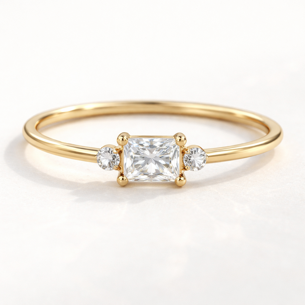 Rectangular princess cut diamond in the middle, 1 stone each on side, thin gold ring, minimalist style