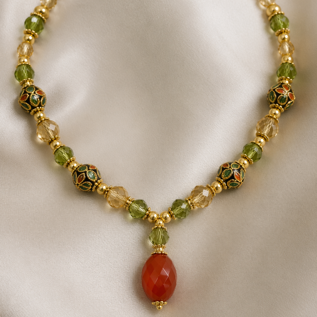 photorealistic jewelry design, Cloisonné gold round beads peridot round faceted beads champagne crystal faceted round beads gold round beads carnelian oval faceted beaded necklace with gold Czech glass seed beads , art_deco style, just the design no text