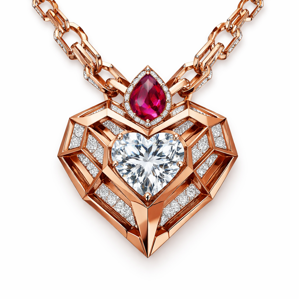 Geometric pendant of heart with chain of architecture shape and edges of bold style with white diamond and ruby of white background for women