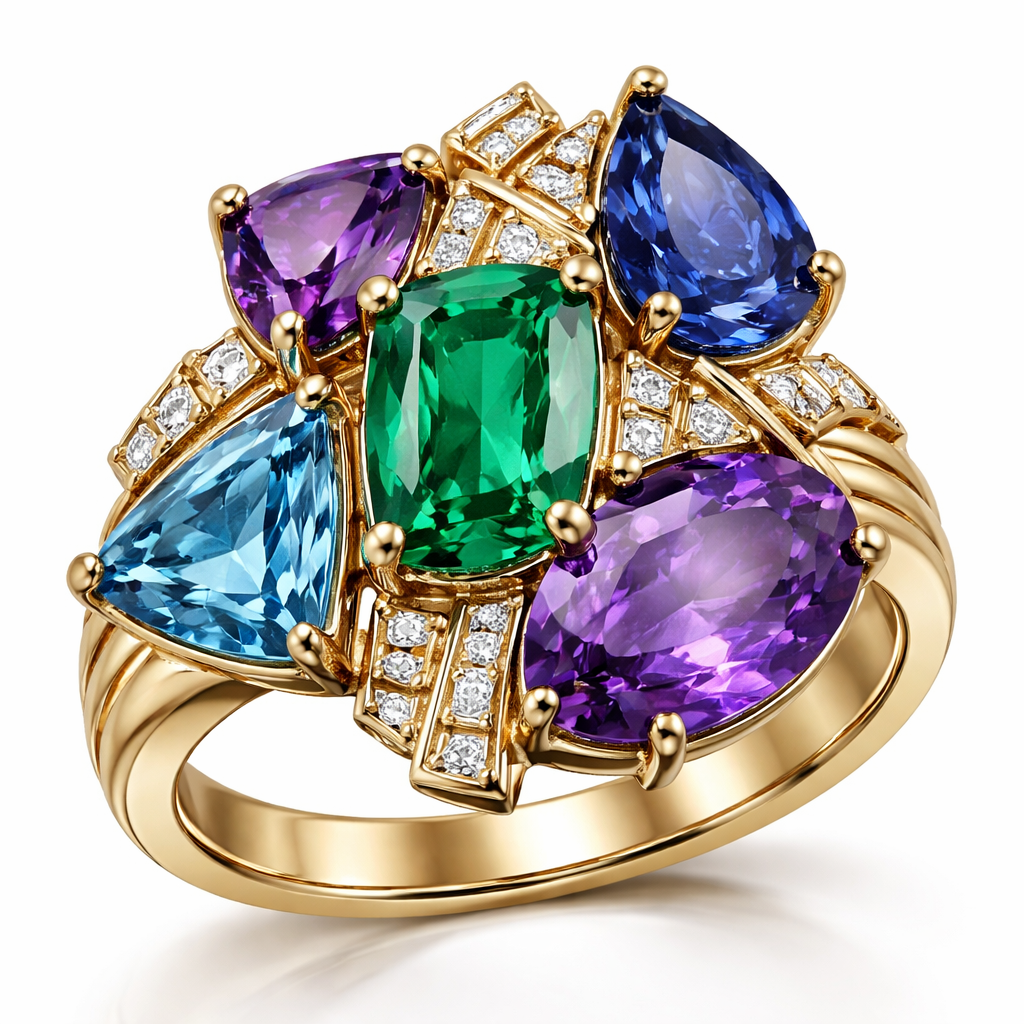 Create an abstract cluster of gem stones including 1 each of emerald, blue sapphire, two amethyst and a blue topaz use different shapes. yellow gold band with gold prongs., art_deco style