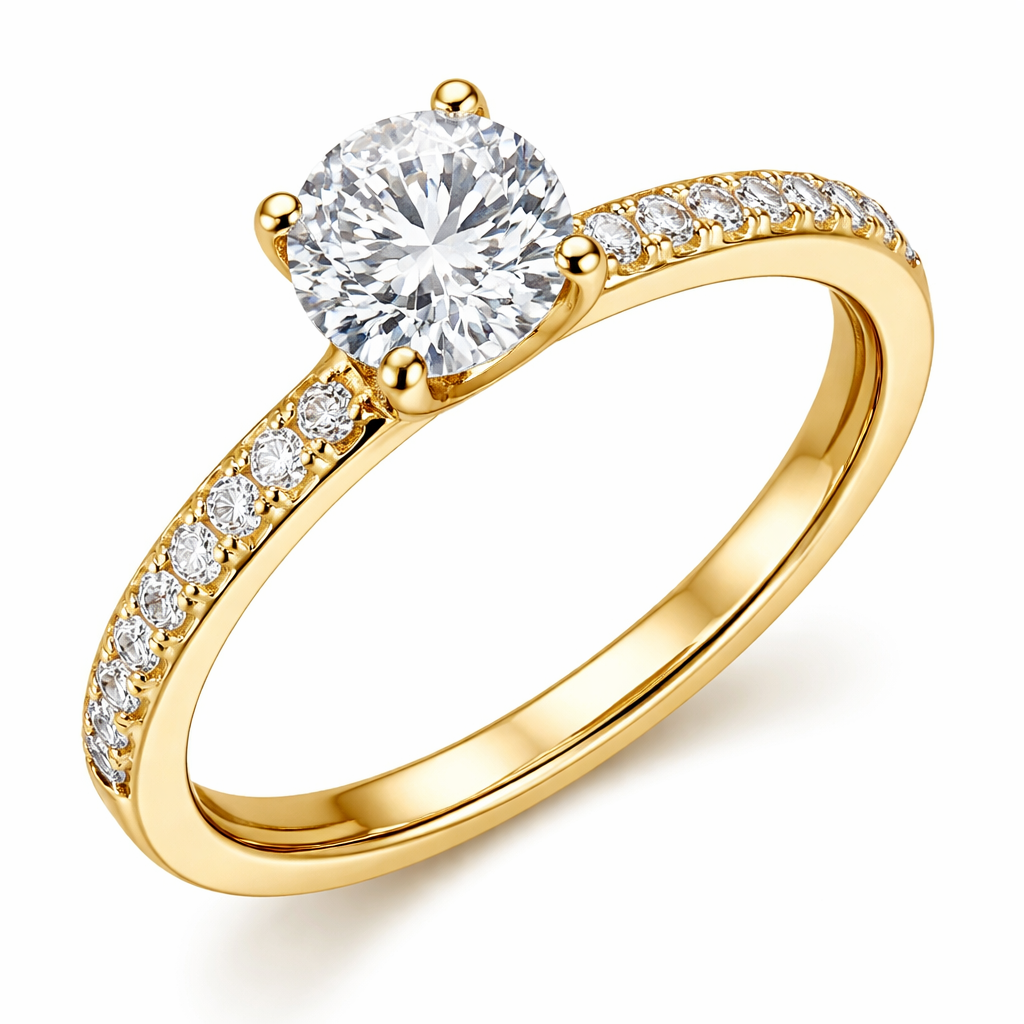 Create me a yellow gold four claw solitaire ring with Diamonds set shoulders
