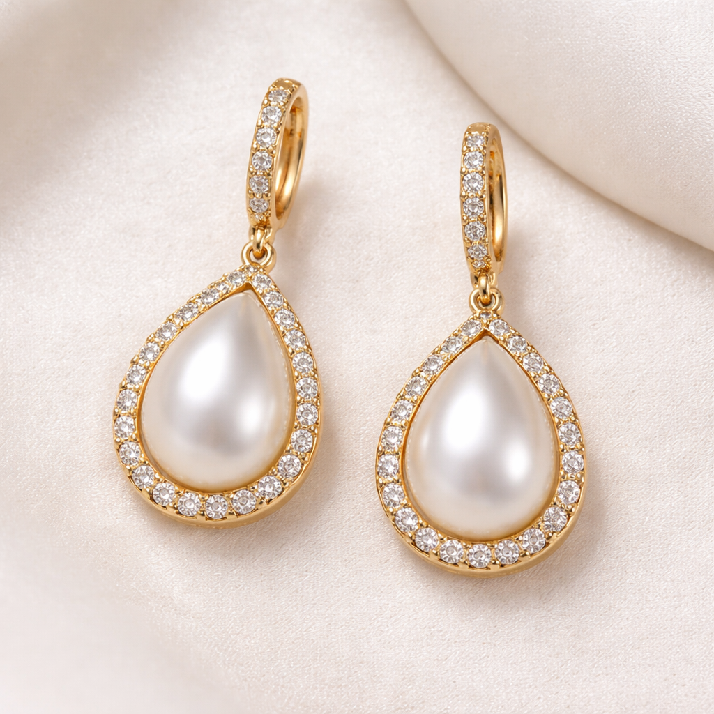 Pear shaped pearl drop earrings with gold border and with pavé diamonds, everyday wear