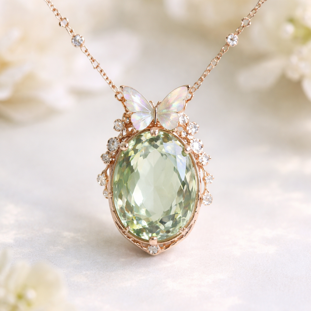 A light vintage coloured necklace with a skinny oval shaped light vintage green vivid gem and a tiny butterfly carved gem on top of it, nature_inspired style