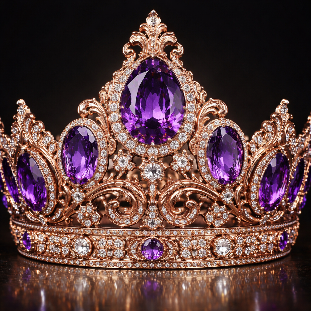 A crown with extreme rich amathyst gems with diamond surroundings and rose gold carvings on the crown