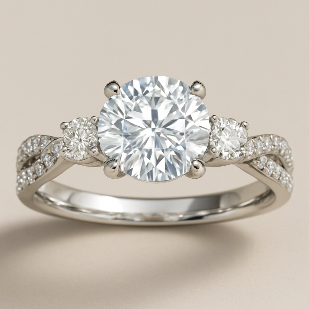 Round 3carat solitaire with a .6 carat inset diamond on each side and twist pave band