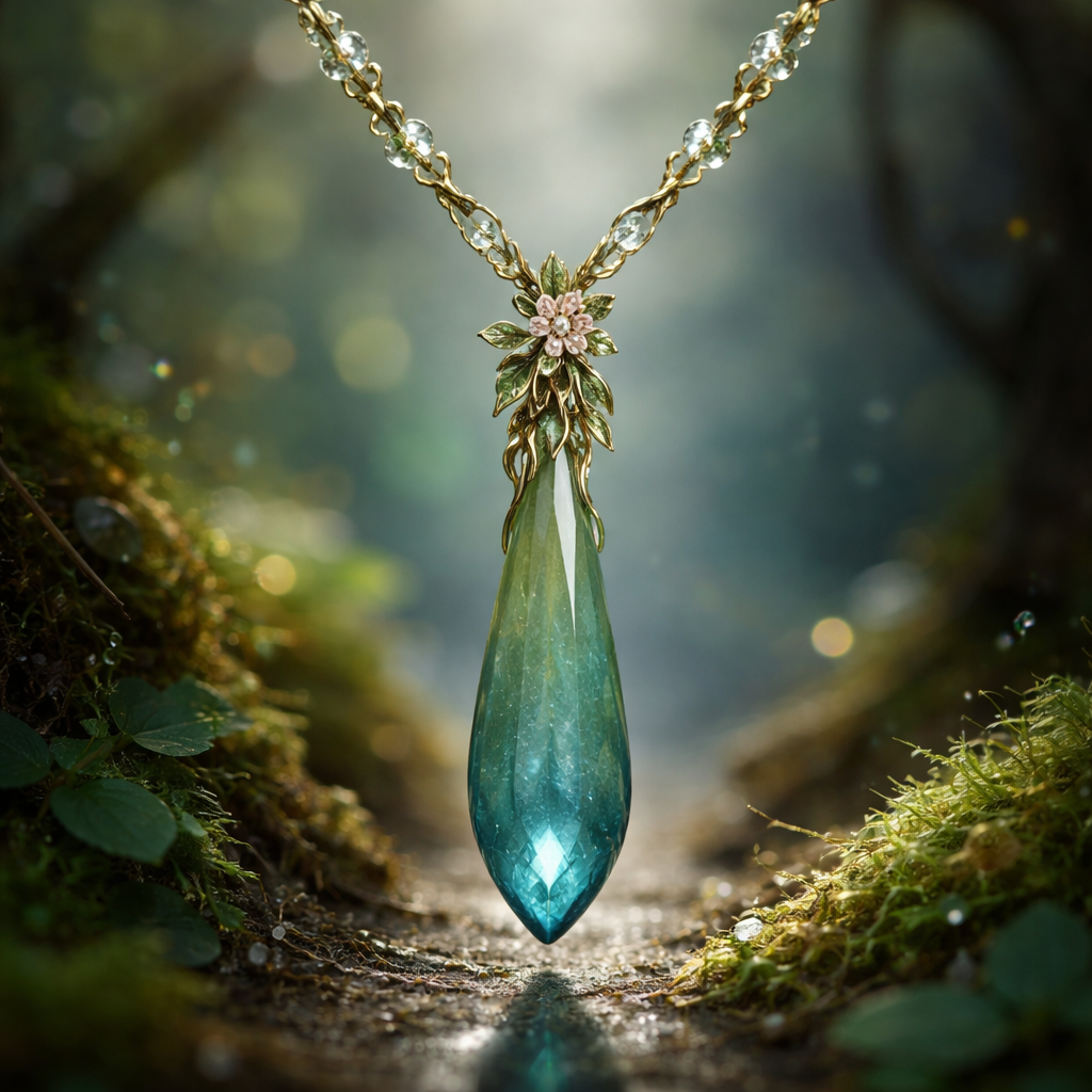 A beautiful necklace with a skinny teardrop shaped gem, nature_inspired style