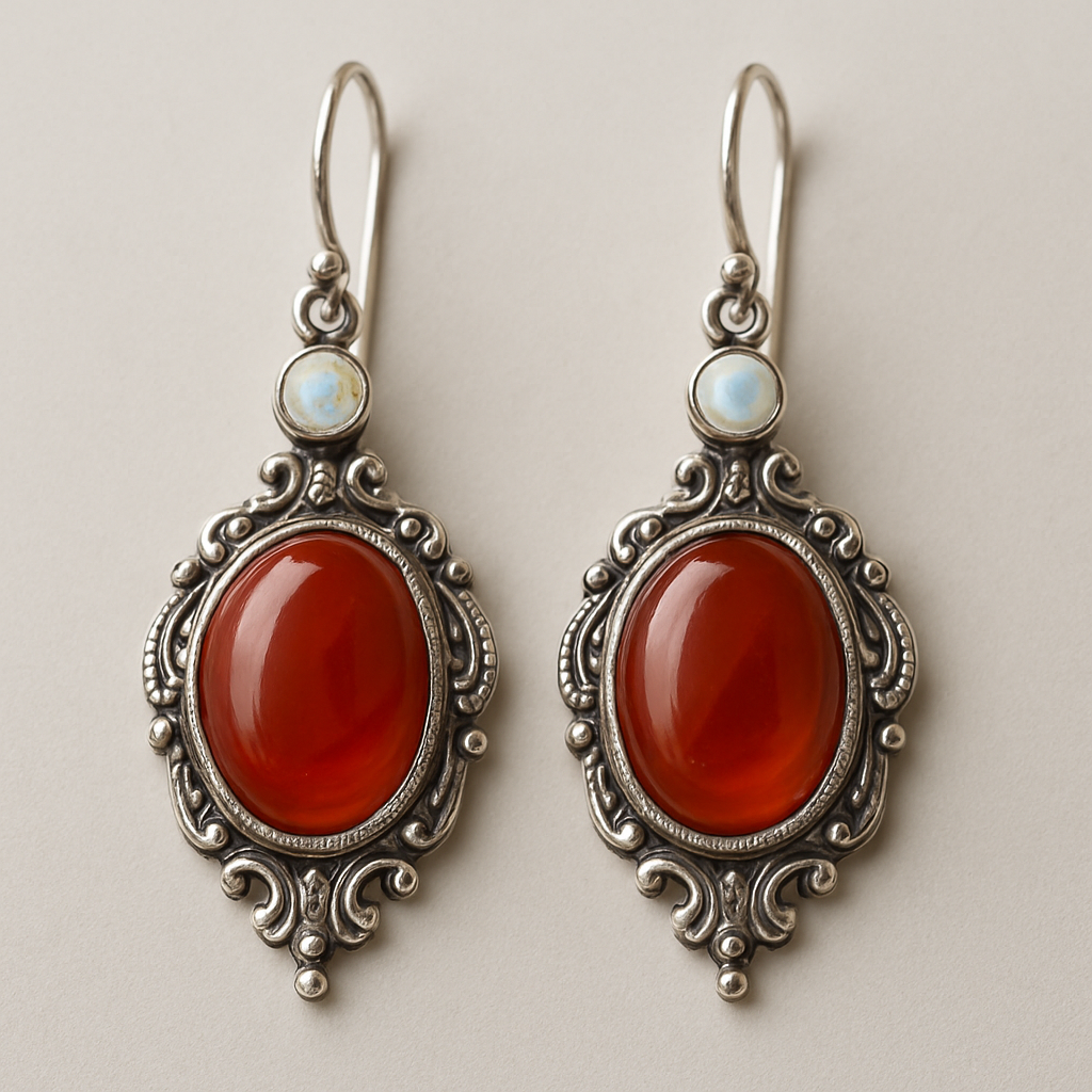 Carnelian oval stone, silver earrings with round opal accent, georgian style
