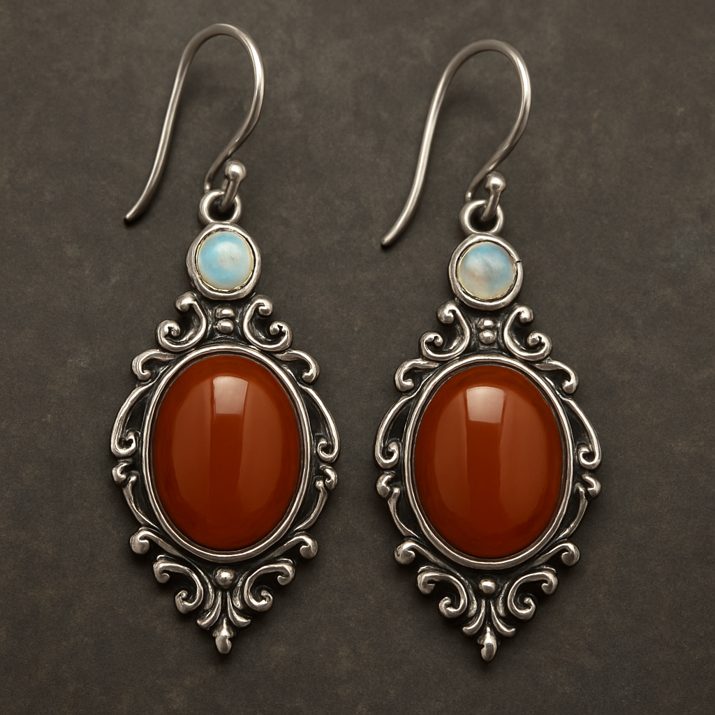 Carnelian oval stone, silver earrings with round opal accent, victorian style