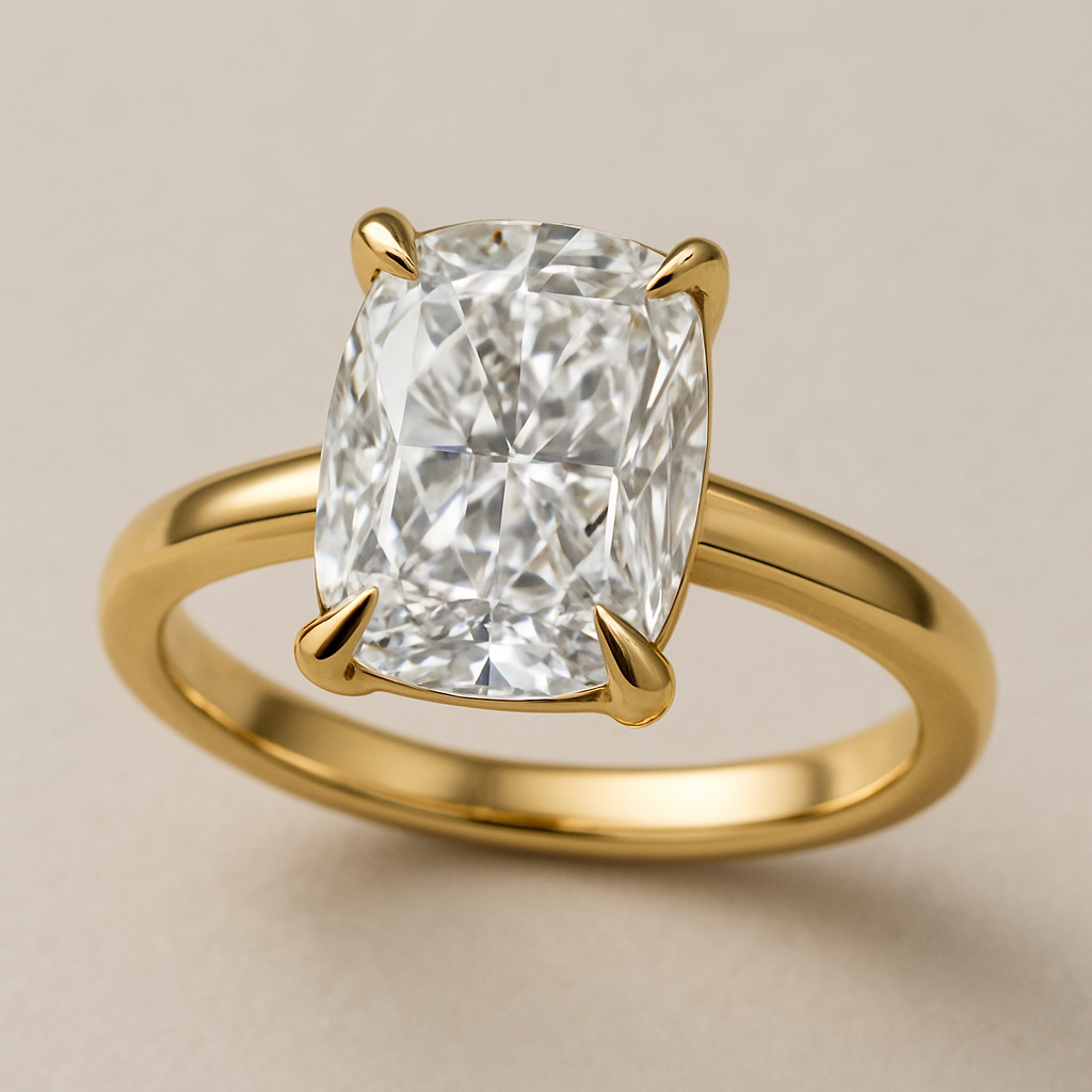 Elongated cushion, cut diamond set in yellow gold band, taping with Talon prongs, statement style