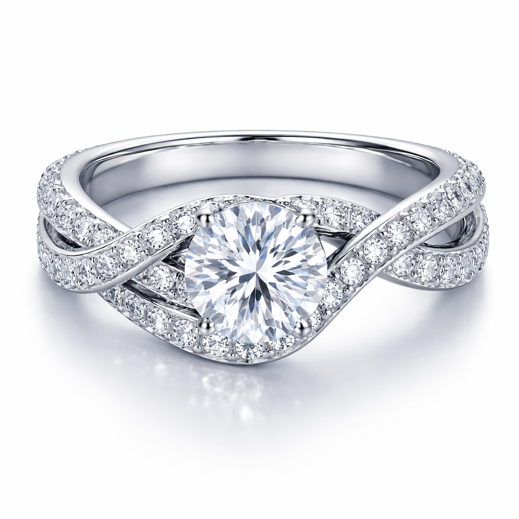 A romantic women's ring made of white gold with diamond stones suitable for engagement. make criss cross band with diamonds look like it's coming from underneath the center stone at 2 corners and another band of diamonds around one side of that, romantic style