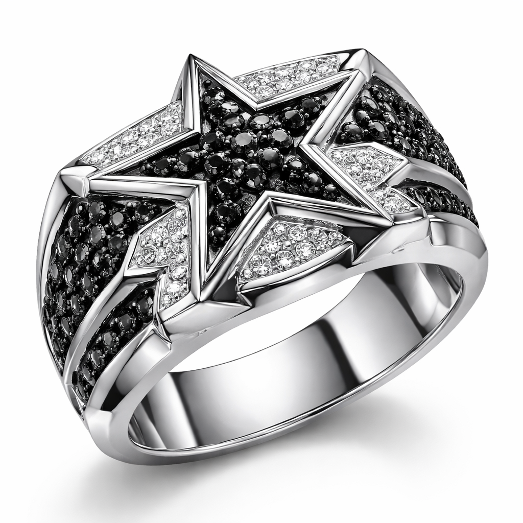 A star ring for men Unique design of edges and bold shapes of nice unique star with black diamonds and white diamonds of white background