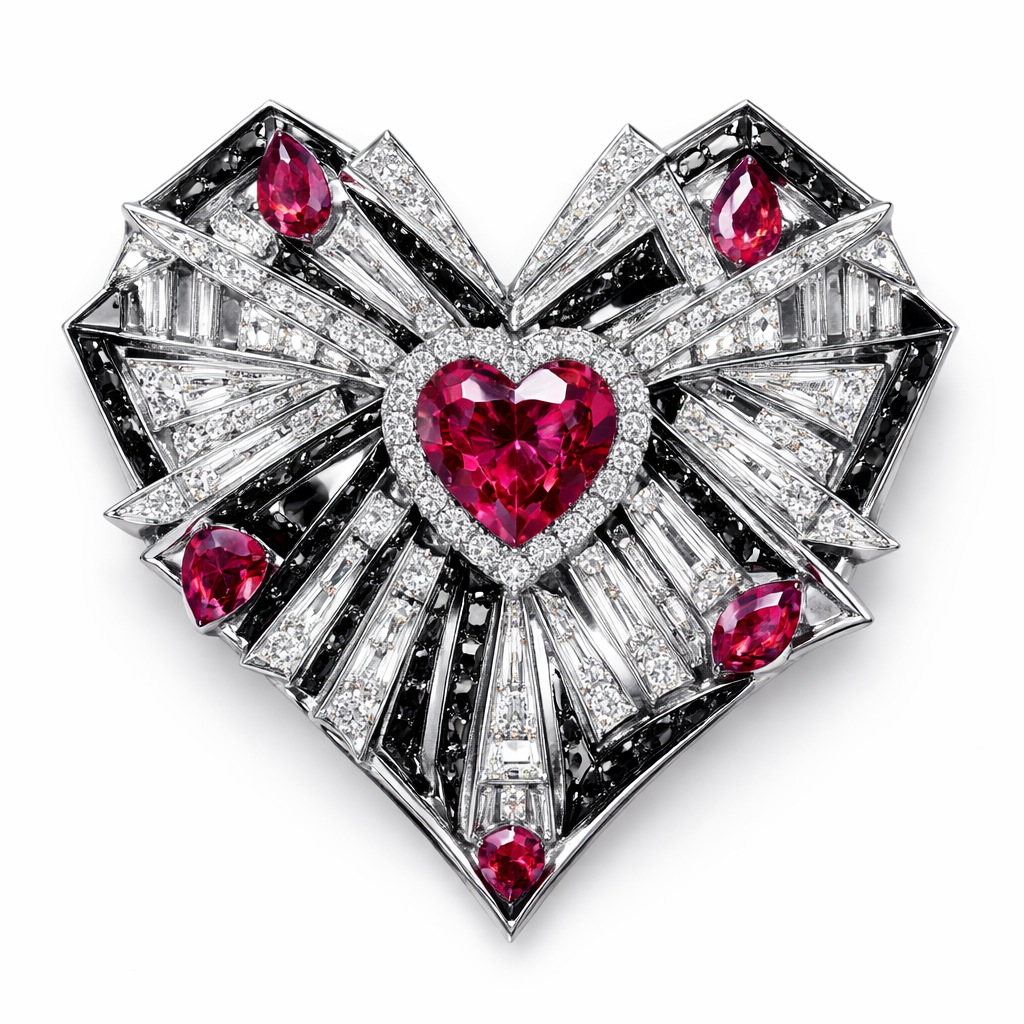 Geomatric love for valantine eve of architecture shape and edges of white and black diamonds and ruby of white background