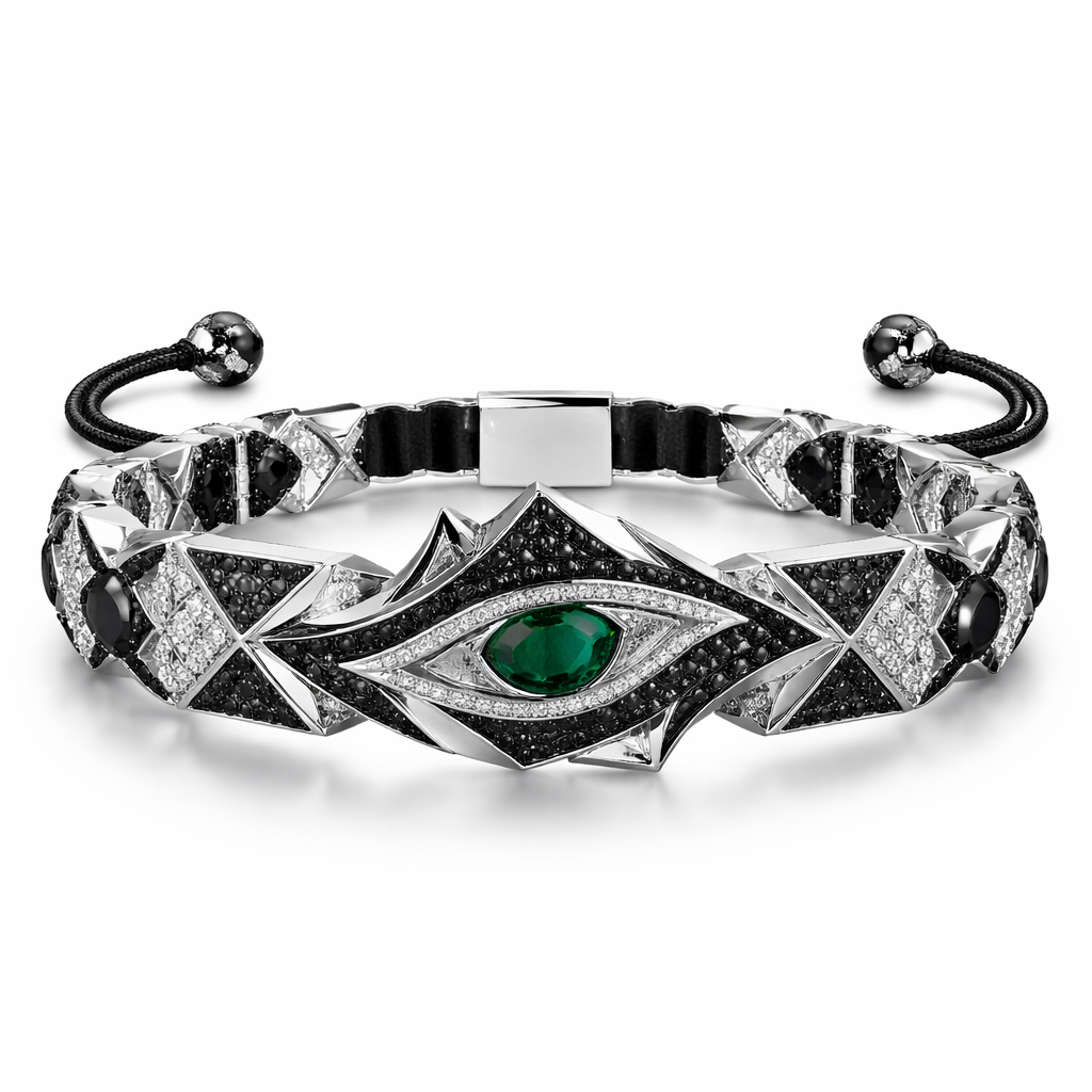 Geomatricw sharp edges of architectural shapes and design of bracelet chambala for men of white and ablack diamonds adding eye shape in abstract and artistically way with white background adding one eye artistic shape with green emerald