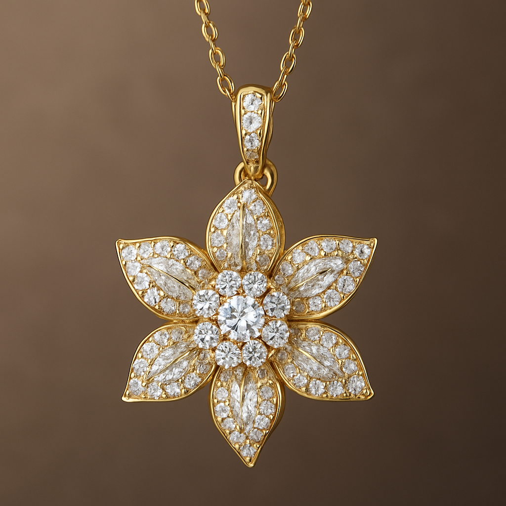 Create a flower style ring with a three-quarter carat center stone and eight round stones set around the center stone in...