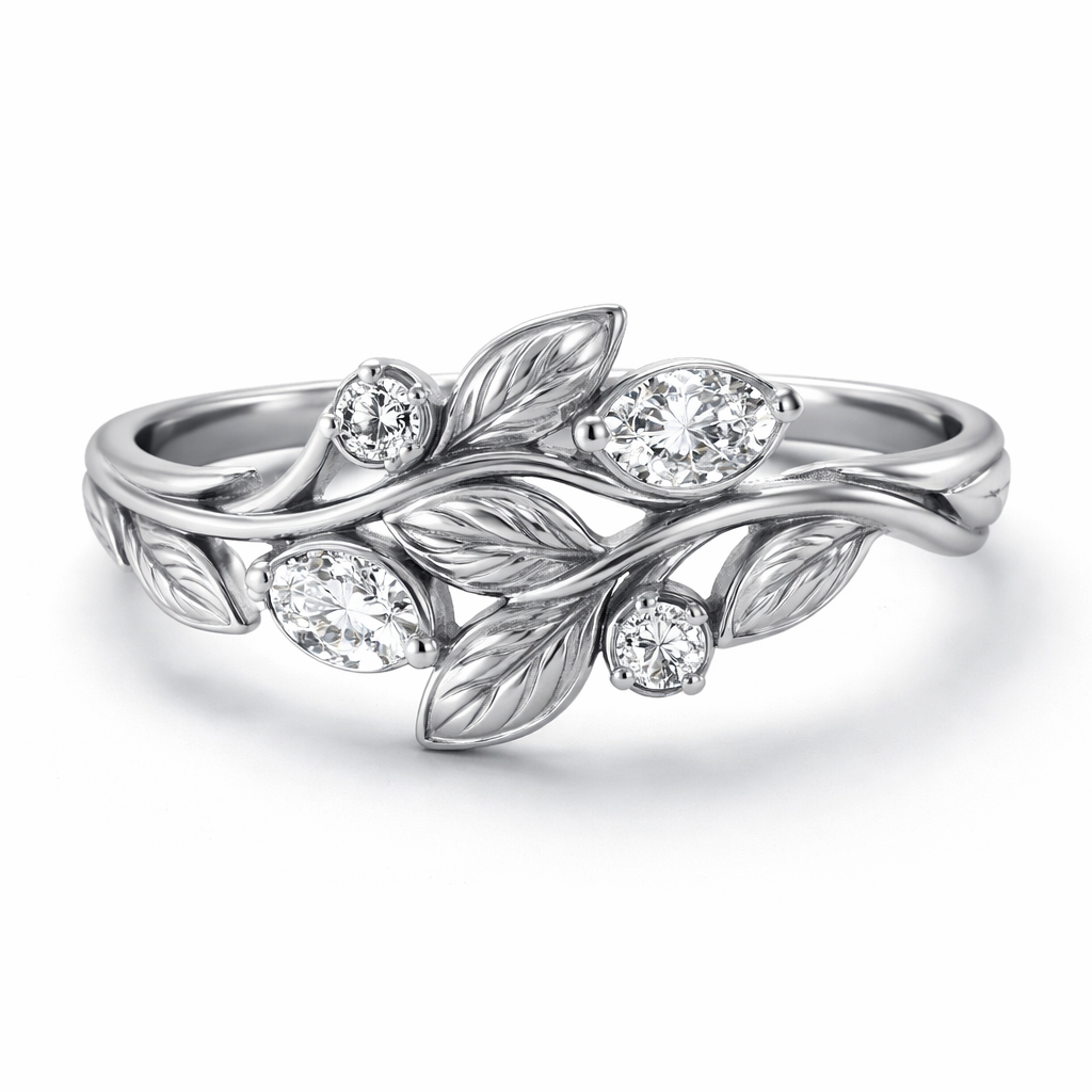 Make a silver foliage ring with four small diamonds two of the diamonds are oval the other 2 are circle