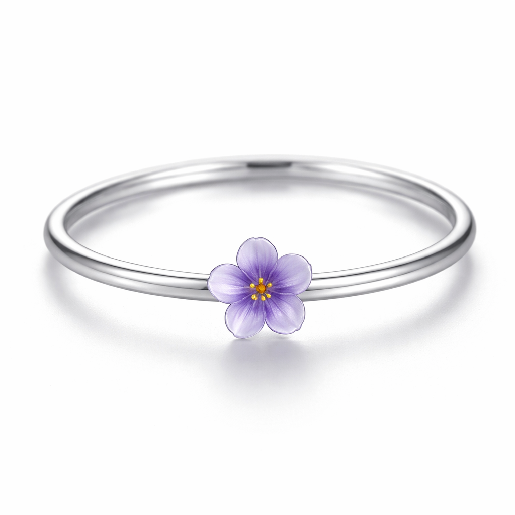 A minimalist women's ring. um anel prata com uma flor violeta nele