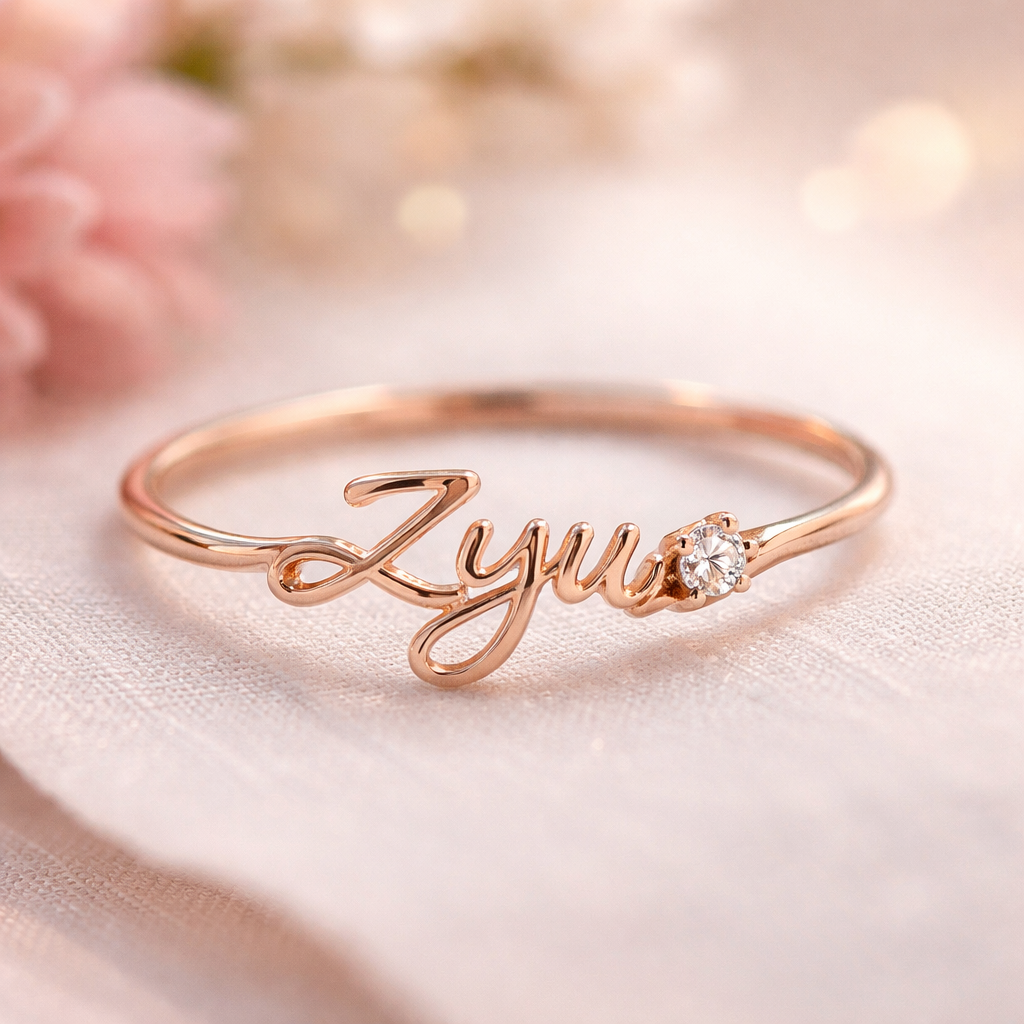 A ring with a tiny casual diamond and the word “ZYU” on it. The word “ZYU” make it artistic and blend into the design I want a casual but romantic ring, romantic style